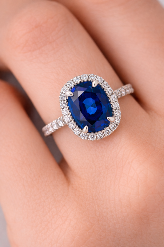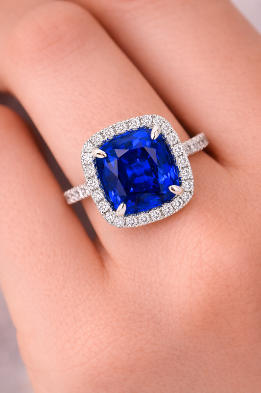 White Gold Cushion Cut Blue Sapphire and Diamond Ring