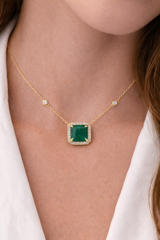 Yellow Gold Emerald and Diamond Halo Necklace