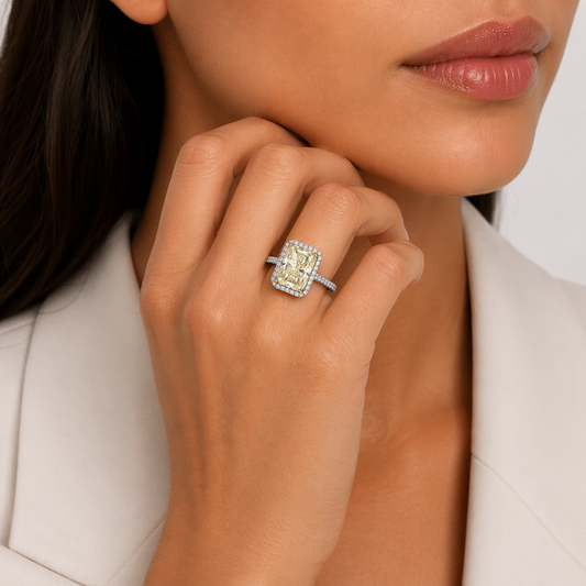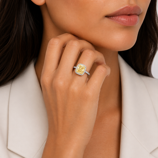 White and Yellow Gold Cushion Cut Lab-Grown Yellow Diamond Engagement Ring