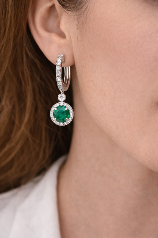 White Gold Emerald and Diamond Halo Drop Earrings