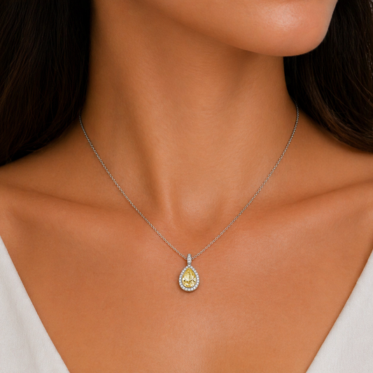 White and Yellow Gold Pear Shape Natural Fancy Yellow Diamond Halo Pendant