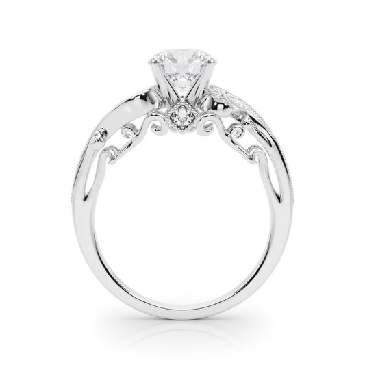14K White Gold Round Brilliant Diamond Antique Floral Split Shank Engagement Ring With Pave Accents