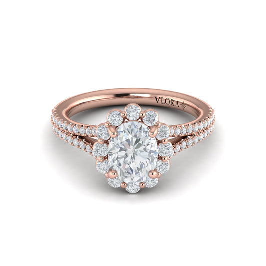 14K Rose Gold Oval Diamond Halo Split Shank Ring