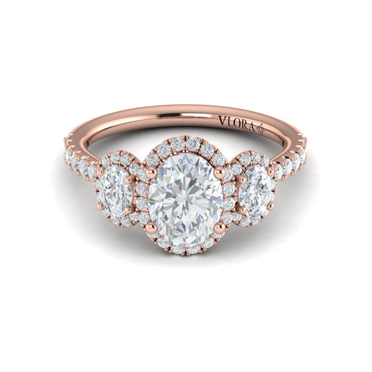 14K Rose Gold Oval Diamond Three-Stone Halo Engagement Ring