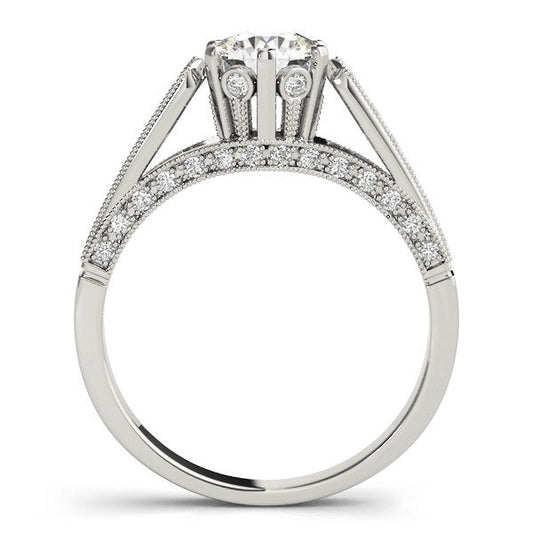 14K White Gold Round Brilliant Diamond Beaded Antique Inspired Engagement Ring With Pave Accents