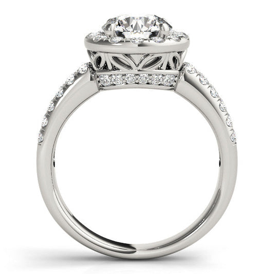 14K White Gold Round Brilliant Diamond Leaf Basket Round Halo Engagement Ring With Pave Accents