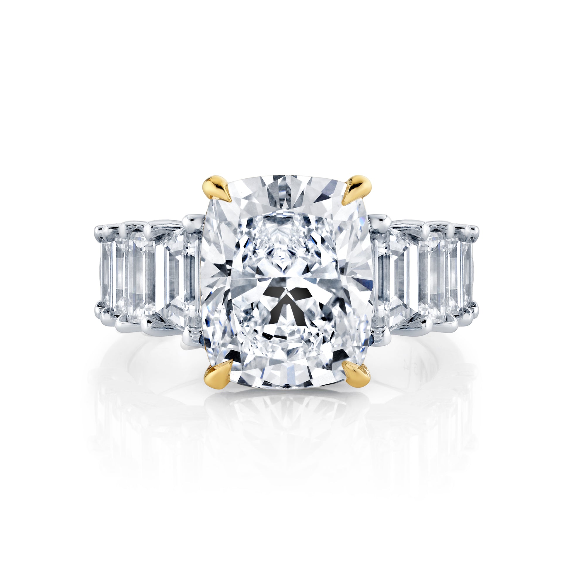A refined engagement ring featuring a 5.19-carat lab-grown cushion diamond (F color, VS2 clarity) accented by baguette-cut lab-grown diamonds totaling 2.35 carats across the band. Crafted in 14-karat white and yellow gold, this 7.54-carat total weight design delivers exceptional sparkle with sustainable luxury. Size 6.5.
