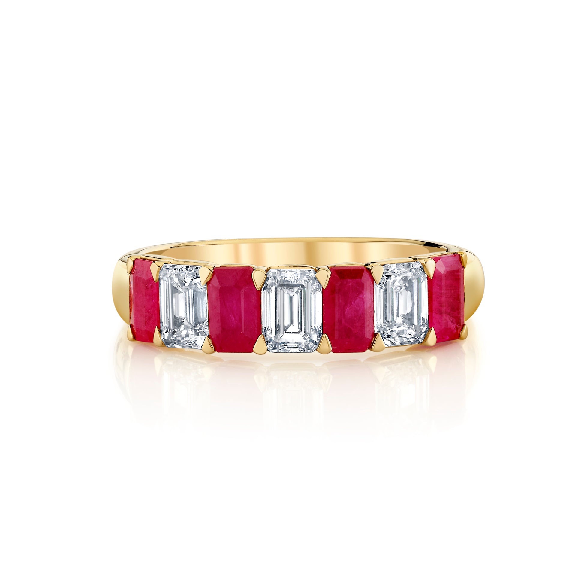This 14K yellow gold ring features four emerald-cut rubies (1.43ctw) and three emerald-cut diamonds (1.39ctw) in a refined fashion design. The warm yellow gold setting enhances the vivid red rubies while showcasing the diamonds' brilliance. A sophisticated choice for size 7.
