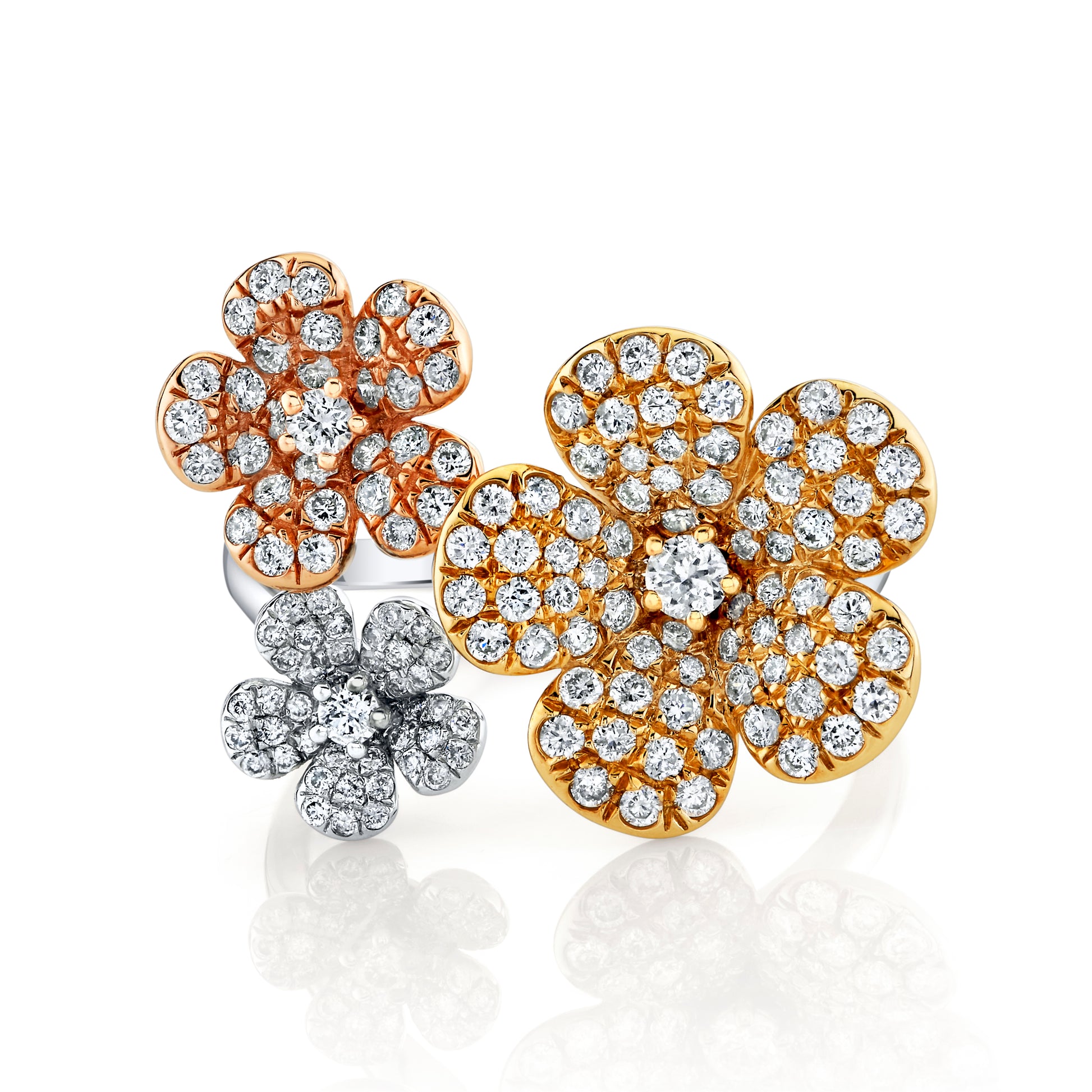 14K Yellow, White, And Rose Gold Pave Diamond Flower Ring