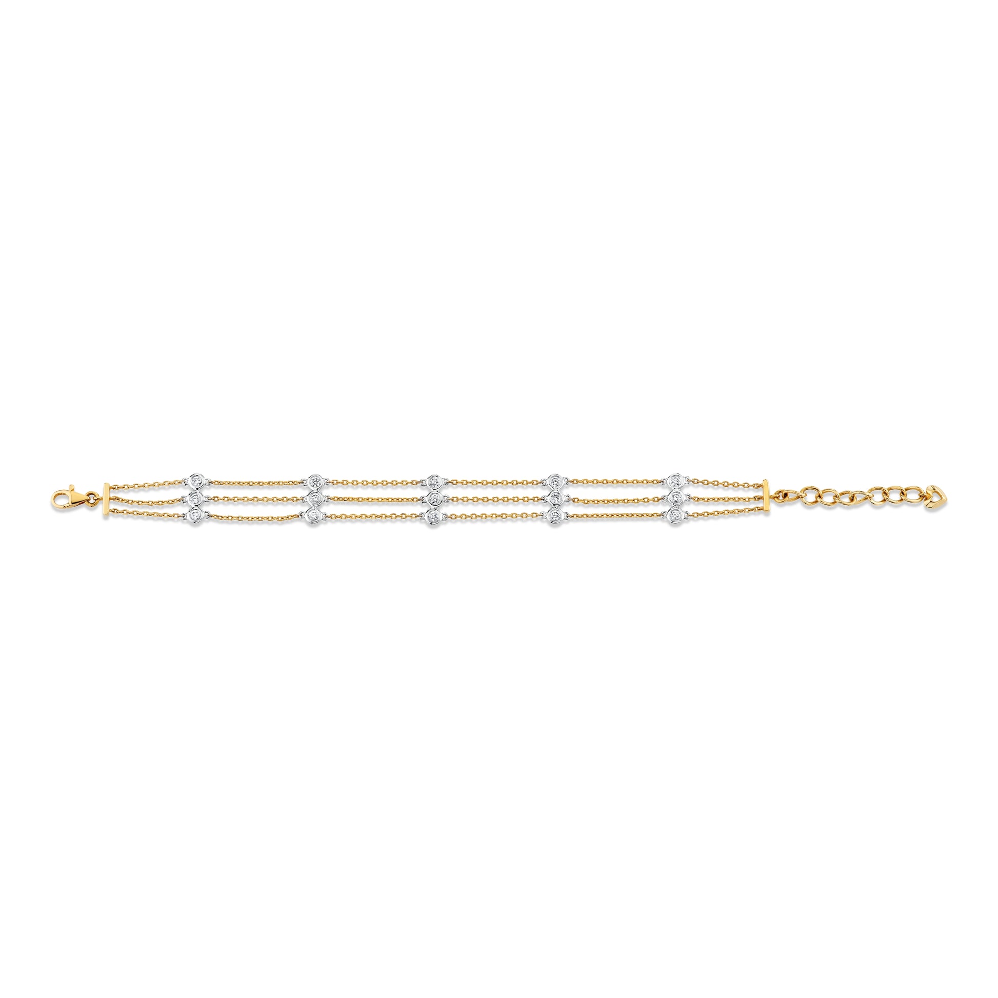 This elegant ladies' bracelet features three delicate rows of 14-karat yellow gold, each accented with round diamonds totaling 0.86 carats of G color and SI1 clarity. The diamonds are expertly set within white gold bezels, creating a sophisticated contrast that enhances their brilliance. Designed in a versatile "by the yard" style, this piece offers refined sparkle suitable for everyday wear or special occasions. Its meticulous craftsmanship ensures durability and timeless elegance, making it a distinguished addition to any fine jewelry collection.