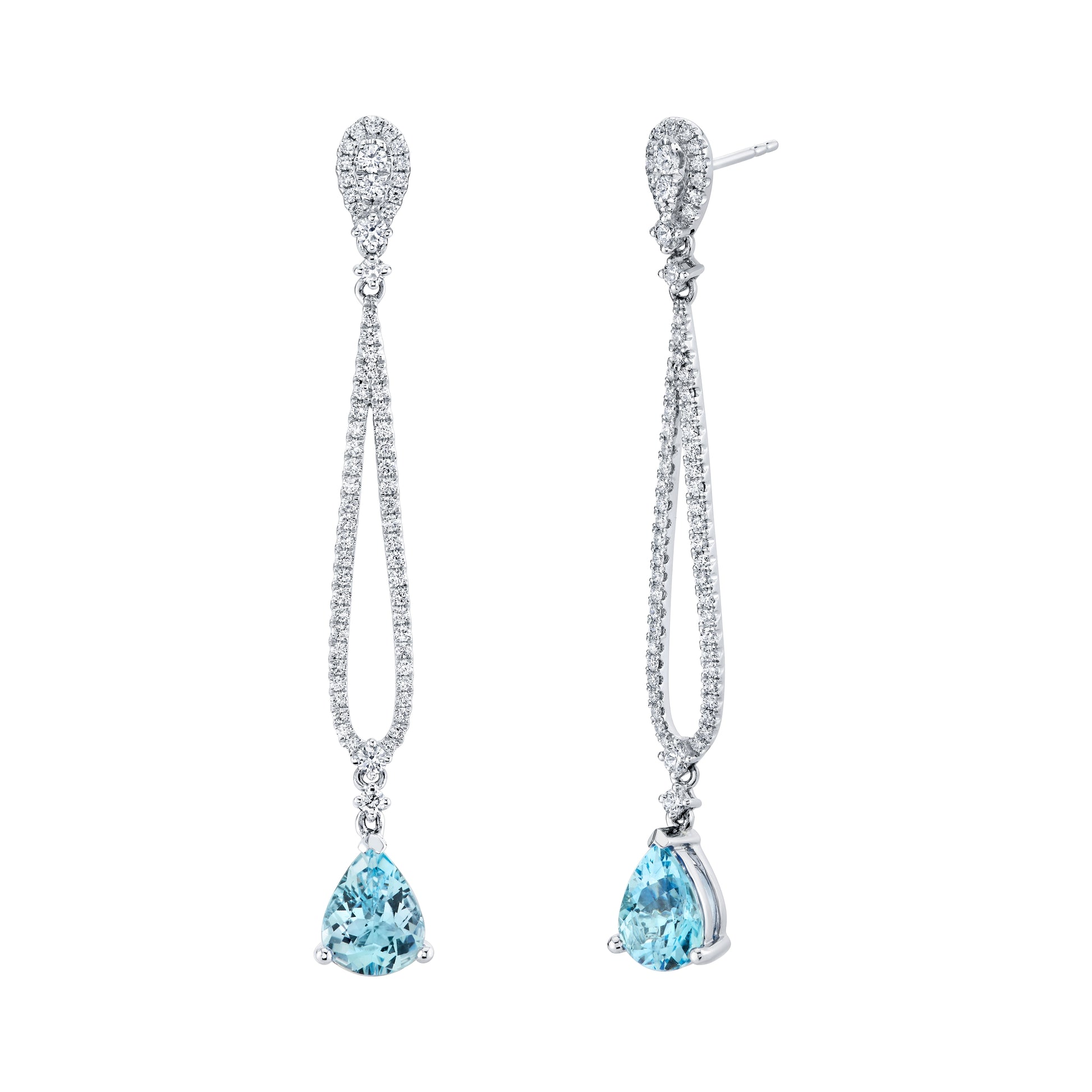 These elegant drop earrings are crafted in white 18 karat gold, featuring two pear-shaped aquamarines totaling 2.60 carats. Complemented by round diamonds with a combined weight of 0.98 carats, the design offers a refined balance of color and brilliance. Perfect for adding sophisticated sparkle to any ensemble.