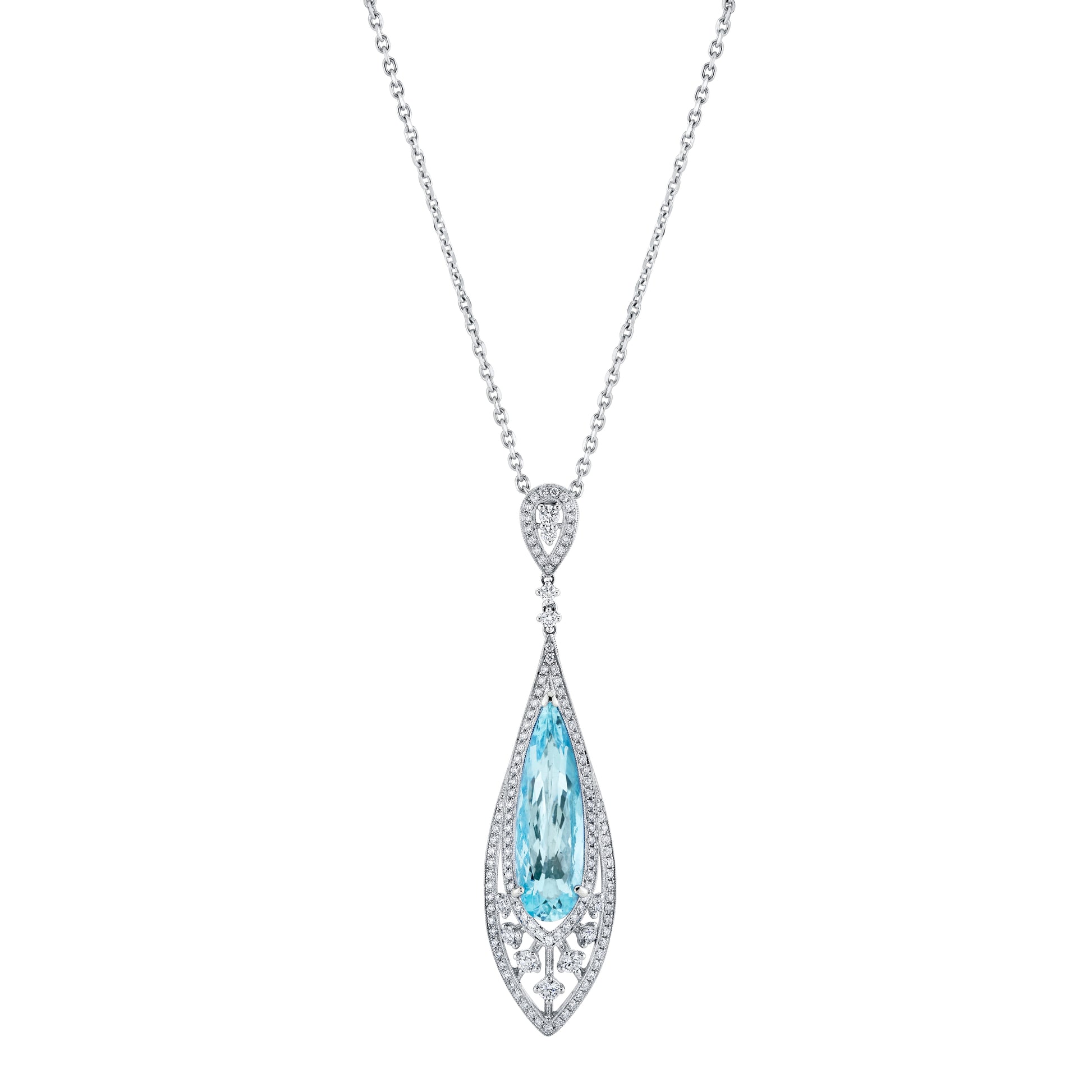 This exquisite 18-karat white gold drop pendant features a stunning 6.91 total carat weight pear-shaped aquamarine, complemented by 1.23 total carat weight of round brilliant diamonds. The carefully selected gemstones enhance the pendant’s elegance, making it an ideal piece for sophisticated, timeless style. Perfect for special occasions or refined everyday wear, this pendant combines expert craftsmanship with luxurious design.
