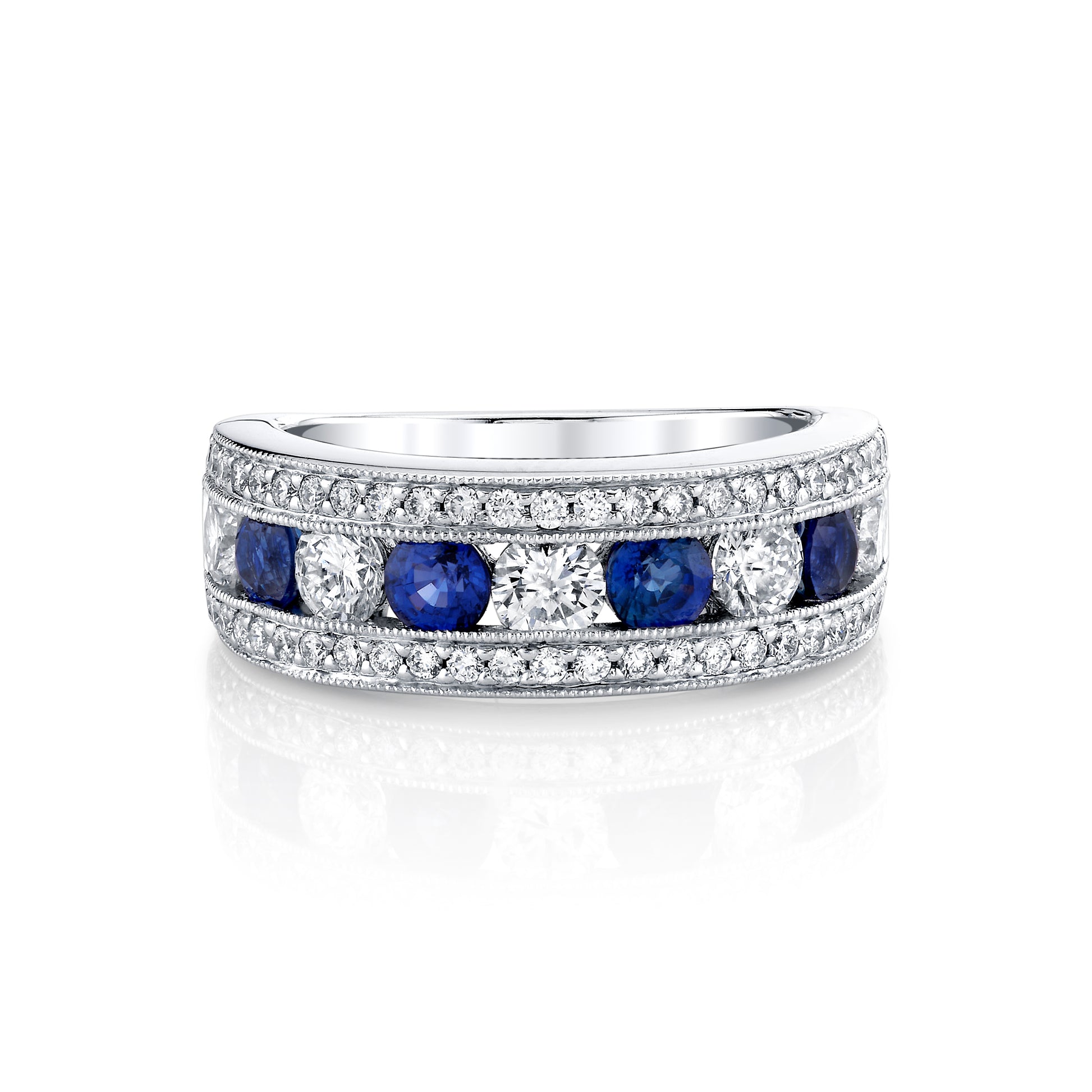 This elegant 18K white gold fashion ring showcases four brilliant round blue sapphires totaling 1.08 carats, complemented by 55 sparkling round diamonds (F/G color, VS1-VS2 clarity) weighing 1.28 carats. The sophisticated design combines the rich, deep blue of premium sapphires with the timeless brilliance of fine diamonds, creating a striking statement piece. Sized at 6.5, this ring exemplifies expert craftsmanship and refined luxury, perfect for those who appreciate distinctive gemstone jewelry with exceptional quality and enduring appeal.