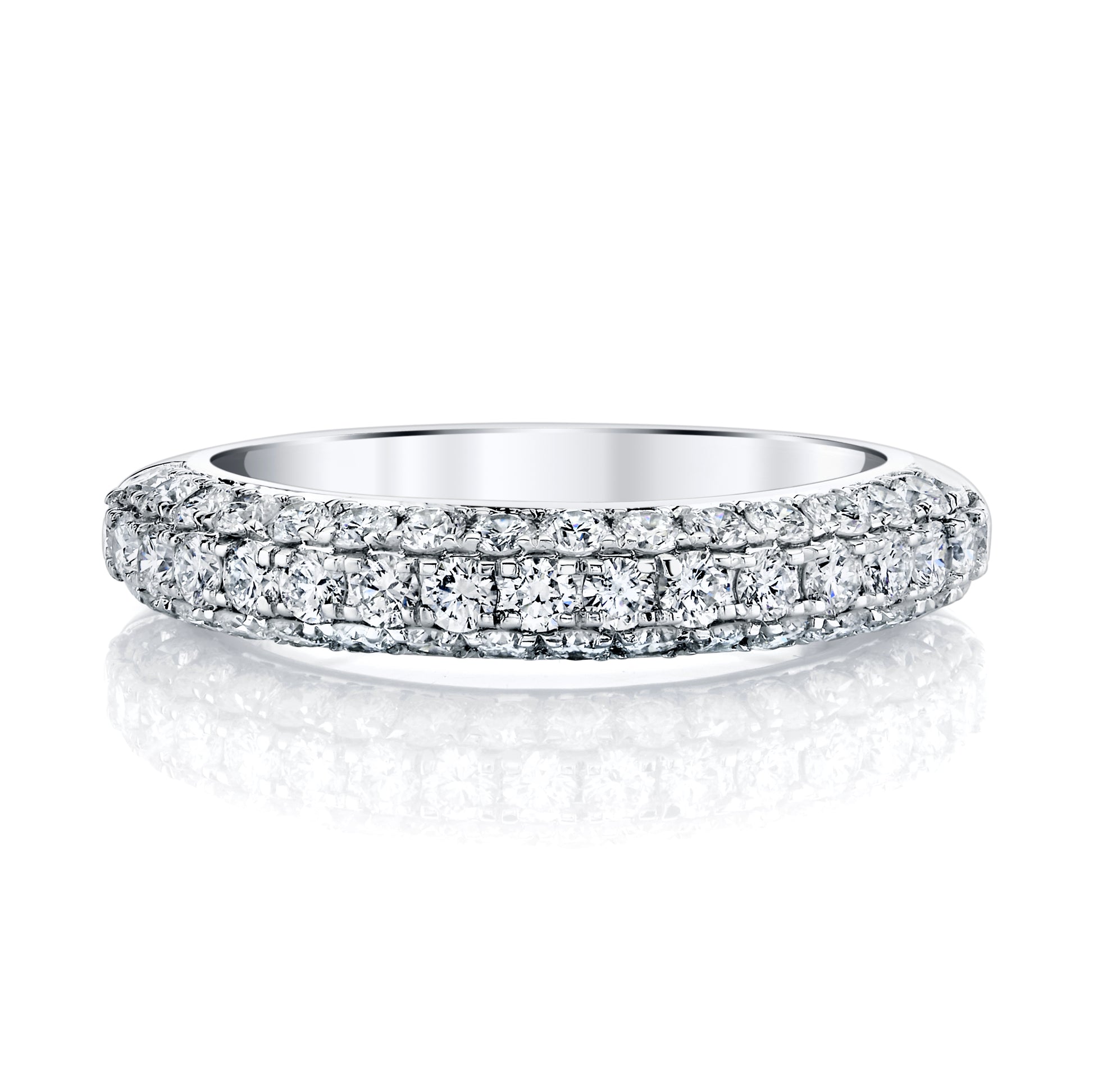 Elegantly crafted in 18 karat white gold, this three-row pave diamond wedding band showcases 43 round brilliant diamonds totaling 1.03 carats. Each stone is graded F/G color and VS1-VS2 clarity, ensuring exceptional sparkle and brilliance. The sophisticated multi-row design creates a luminous, continuous shimmer across the finger, making it an ideal choice for brides seeking timeless refinement. Sized at 6.5, this piece combines classic styling with premium diamond quality for a wedding band that will endure as a cherished heirloom.