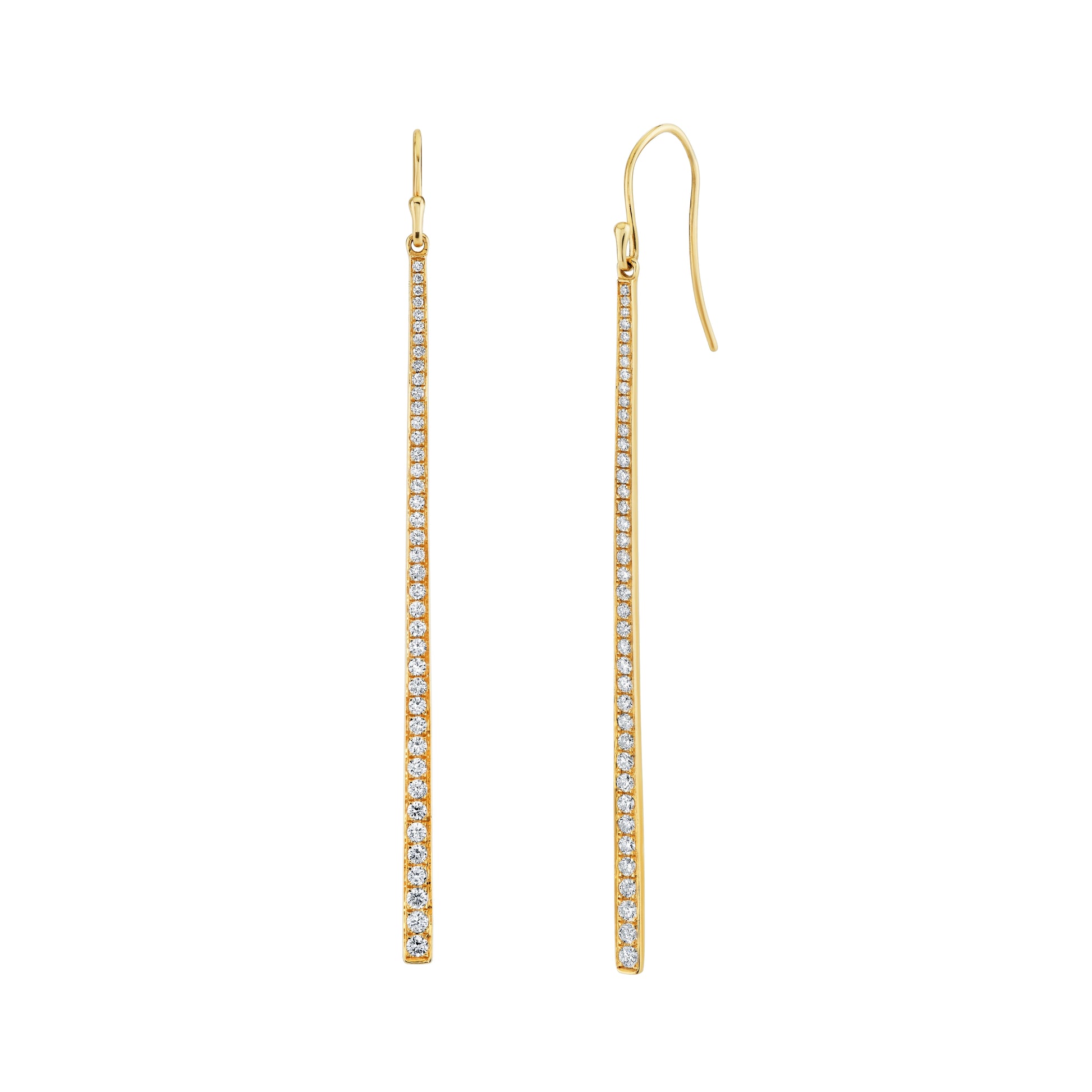 These sophisticated 18-karat yellow gold drop bar earrings feature 80 round diamonds with a combined weight of 0.89 carats. Their sleek design highlights the diamonds' brilliance while providing graceful movement, resulting in an elegant piece that enhances both formal and everyday attire.