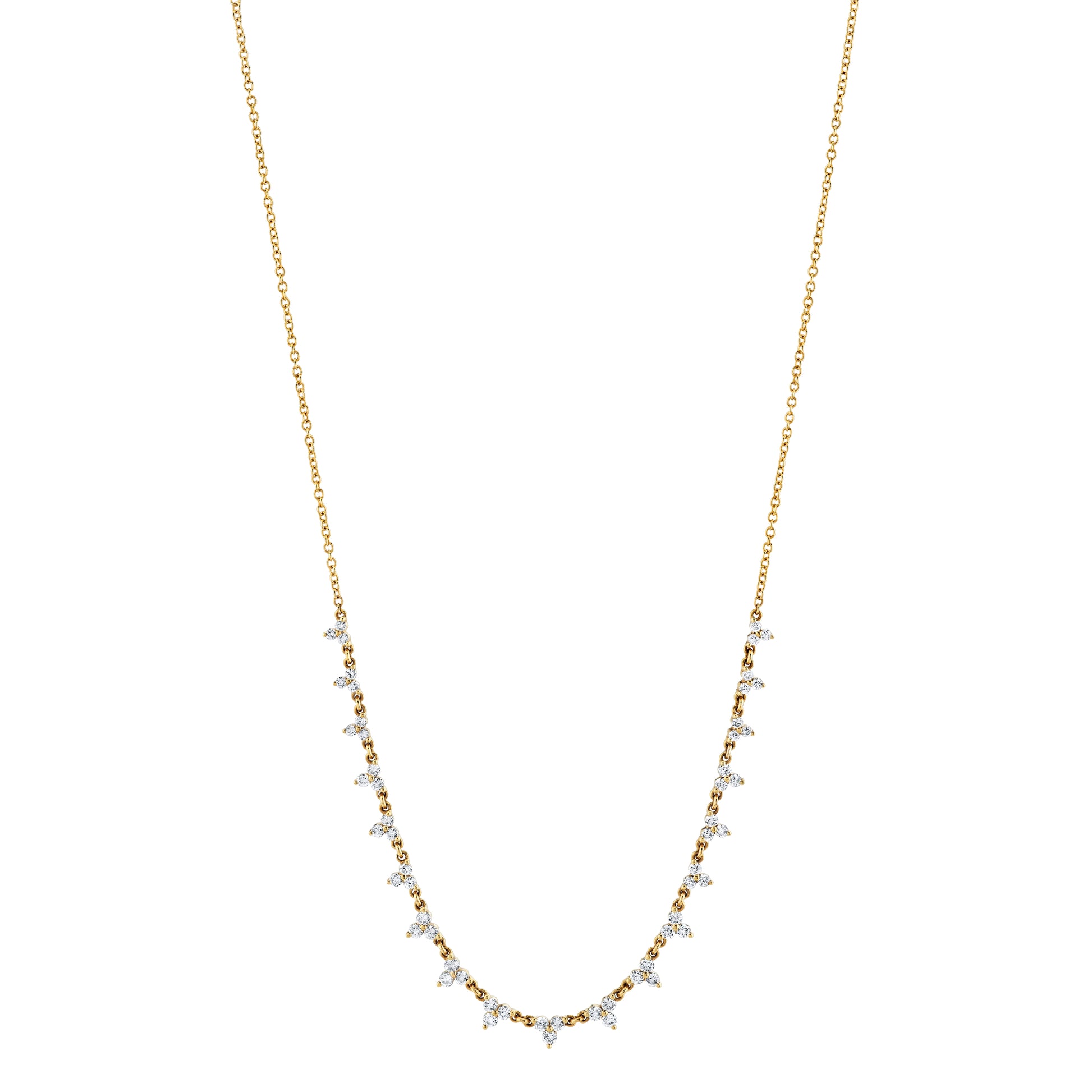 Elevate your everyday elegance with this sophisticated yellow gold necklace, expertly crafted in 18K gold. Featuring 57 meticulously selected round diamonds totaling 1.12 carats, each stone is graded F/G color and VS clarity—ensuring exceptional brilliance and eye-clean quality. The timeless design complements any occasion, from casual refinement to formal sophistication. A versatile investment piece that combines luxury craftsmanship with enduring style.