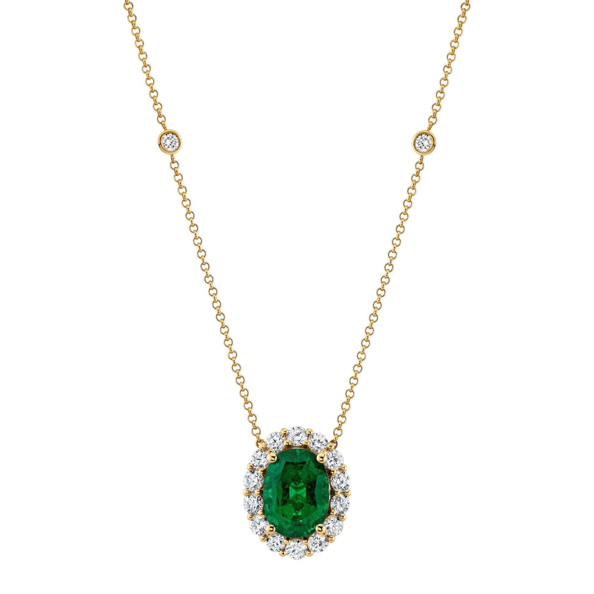 An 18-karat yellow gold necklace featuring a 3.69-carat oval green emerald surrounded by twenty round diamonds (1.64ctw, G/H, VS2-SI1). The 18-inch length provides versatile wear, while the combination of vibrant emerald and brilliant diamonds creates a refined, timeless piece for the discerning collector.