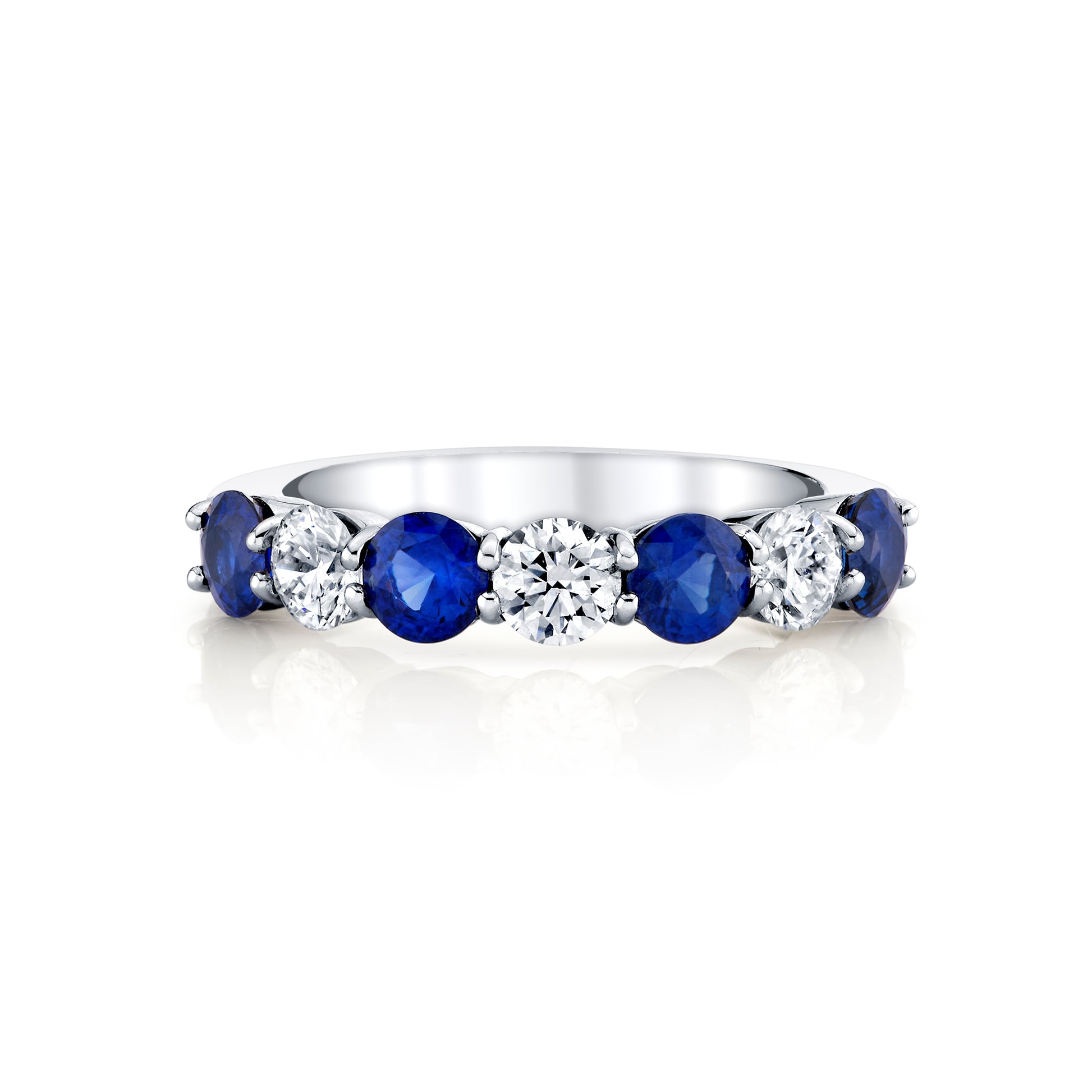 This platinum ring features four Ceylon blue sapphires (1.42ctw) paired with three F/G VS2 diamonds (0.71ctw) for a refined, elegant look. The expertly balanced design combines sapphire's deep richness with diamond brilliance, creating a versatile piece for any occasion. Size 6.5.