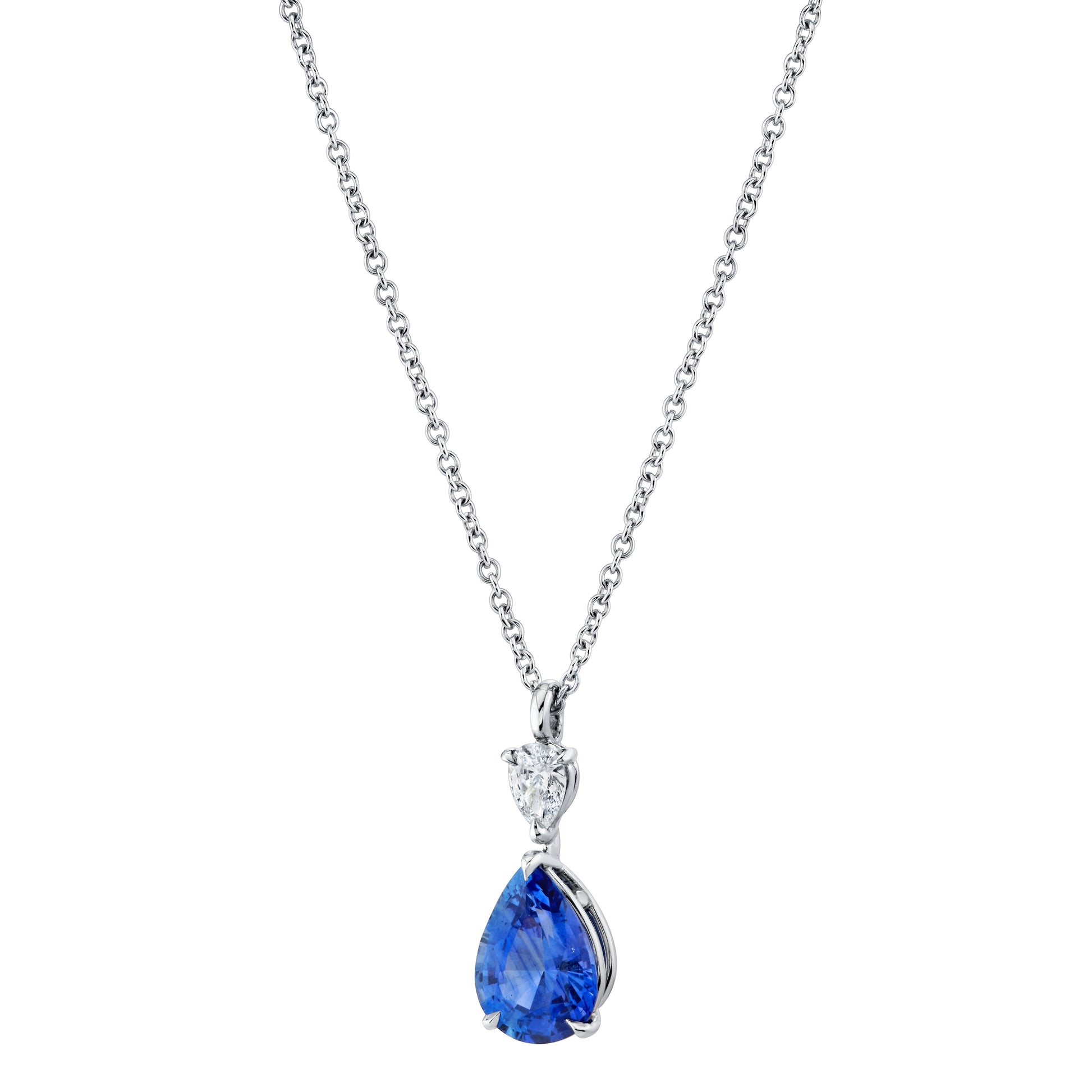 This elegant platinum pendant necklace features a 2.11-carat pear sapphire paired with a 0.18-carat F/G VS1 diamond, suspended from an 18-inch chain. A refined choice for those who appreciate fine gemstones and exceptional craftsmanship.